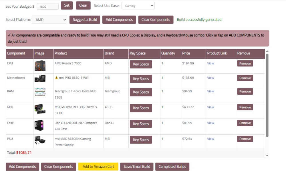 Perhaps most importantly, saved builds include direct purchase links through Amazon, streamlining the transition from planning to actual building. This integration eliminates the need to manually search for and verify component availability and pricing across multiple retailers.